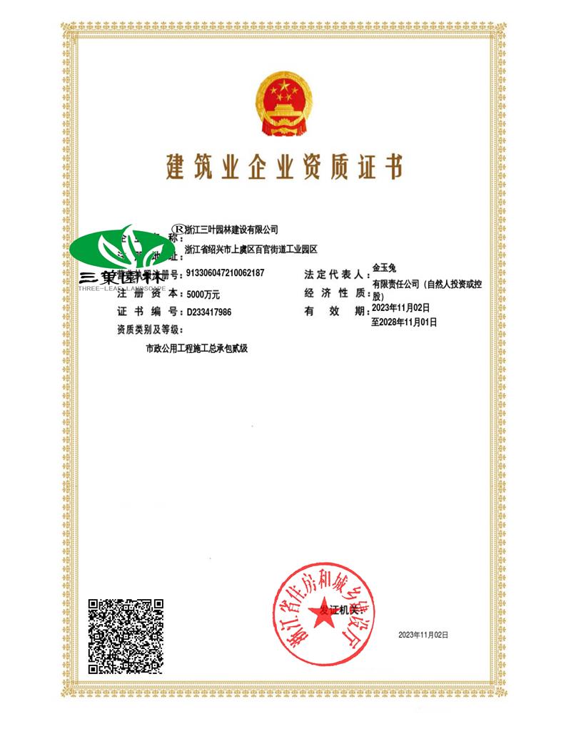 • 三葉園林獲批市政公用工程總承包貳級